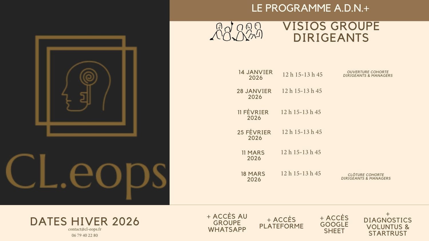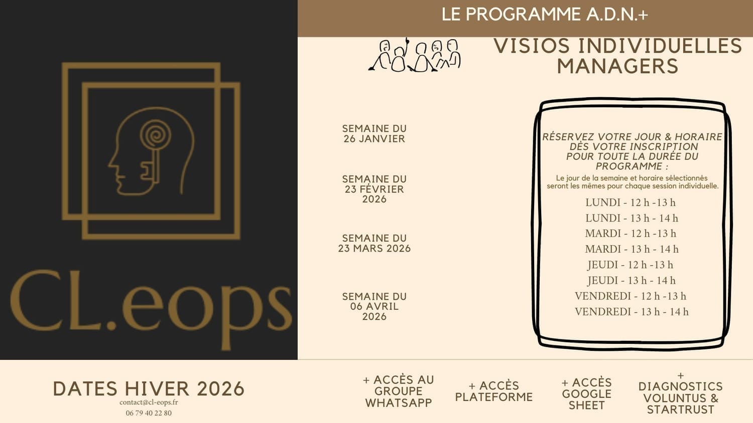 Le programme A.D.N.+ est un programme unique car il s'appuie sur 25 ans d'expérience en management d'équipes et associe différents outils, méthodes et formats complémentaires permettant d’inscrire des changements dans la durée grâce à leur innovation et leur association, à savoir :