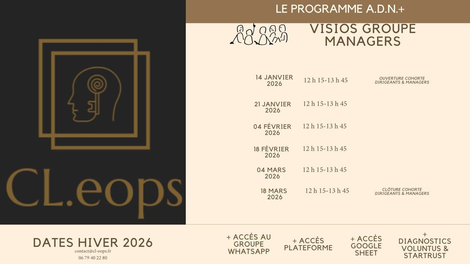 Le programme en ligne est le même pour les dirigeant(e)s et managers, à l’exception des sessions en groupe en visio Zoom : les sessions groupe sont organisées séparément : une session pour les dirigeant(e)s d’un côté une semaine et une session pour les managers de l’autre, l'autre semaine, les problématiques rencontrées pouvant être différentes.