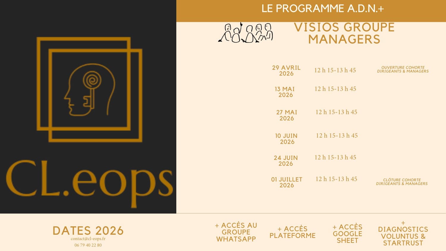 Un groupe "dirigeant(e)s" et un groupe "managers" distincts pour 4 sessions live en groupe.